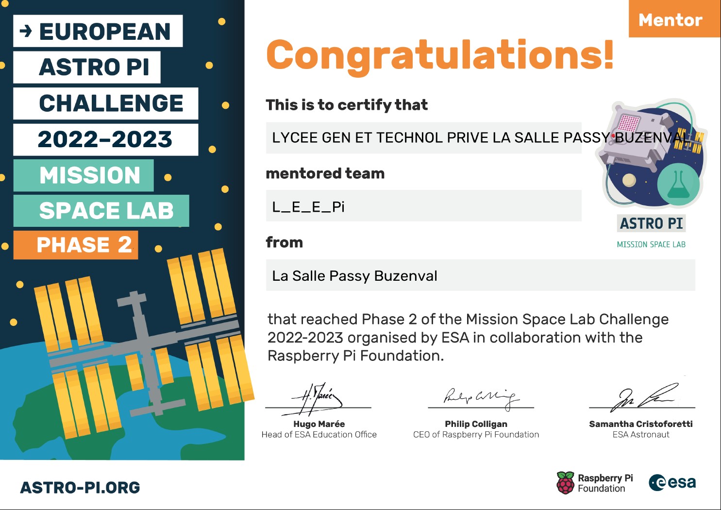 Corentin DEL POZO, George Alexandru UZUNOV, Adrian VIDAL et André ESQUELISSE ont participé à la Mission Space Lab du challenge européen Astro Pi parrainé par l'E.S.A. (Agence Spatiale Européenne), il ont pu travailler sur un Raspberry Pi équipé d'une caméra 6mm, d'un capteur infra-rouge et d'un module de machine-learning !